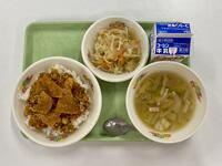 牛乳 スパイシータコス丼 こんにゃくサラダ 白菜とベーコンのスープ