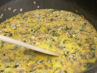 今日の主食は、たっぷりの牛乳と様々な具材を入れたクリームスパゲティです。具材はバターでいためていますが、小麦粉は使っていないので、さらっとした口当たりになっています。クリームソースの出来上がりは並々とした水分量がありますが、これをすべてスパゲティに吸わせていきます。スパゲティは、アルデンテよりもさらに固く芯が残るくらいにゆでてソースに投入。食缶の中で汁を吸ってくれるので、食べ始めるころにちょうどよい固さに完成します。