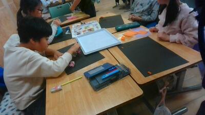 次に、こすりだした生きものを画用紙に切り貼りしています。