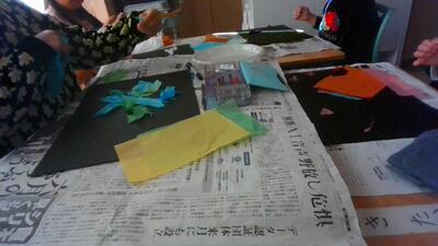 ふわっとのせてみたり、ぎゅっとまるめてみたり…。色画用紙とは違って、透けるほど薄く、柔らかいおはながみならではの感触を活かし、作品をつくりあげていきました!