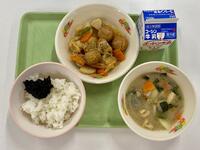 今日の給食は和食のメニューです。のり佃煮は給食室で手作りしました。甘辛いごはんのお供で、食が進んでいる子がたくさんいました。主菜は、つくね・里いも・にんじん・玉ねぎ・しらたき・さやいんげんが入った具だくさんな煮物です。子どもたちは、特に里いもが苦手な子が多い様子でしたが、少しずつ食べ慣れていってほしいと願うところです。