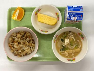 牛乳 五目そぼろごはん 厚焼き卵 かぶと鶏肉のみそ汁 清見オレンジ