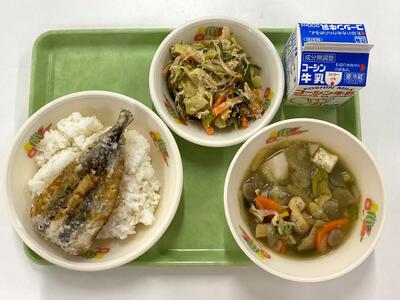 牛乳 いわしのかば焼き丼 ささみと茎わかめの和え物 けんちん汁