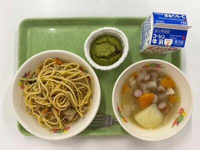牛乳 わけねぎとツナの和風スパゲティ ポトフ 米粉の抹茶蒸しパン
