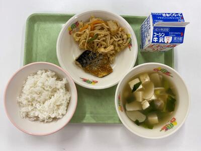 牛乳 ごはん さばの香味みそだれがけ 切干大根の煮物 すまし汁