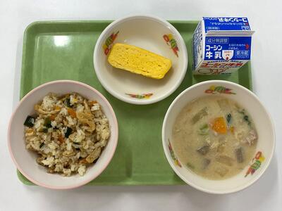 牛乳 こぎつねごはん 厚焼き卵 豆乳みそ汁