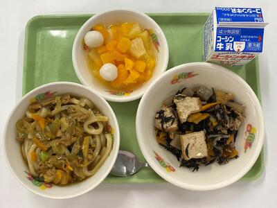 牛乳 カレーうどん 厚揚げの磯煮 フルーツ白玉