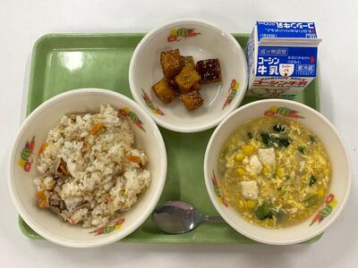 牛乳 ちりめんチャーハン さつまいもの甘辛あえ 中華卵コーンスープ