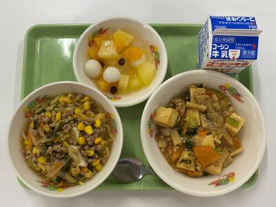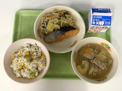 牛乳 コーンと枝豆のごはん 鮭の塩焼き 和風和え 野菜のごま汁