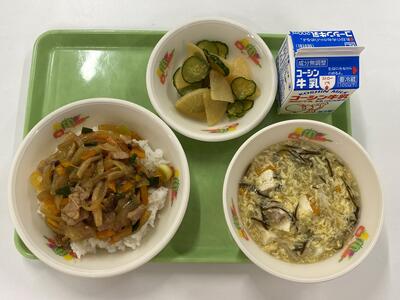 牛乳 豚丼 きゅうりのピリ辛漬け もずくと卵のスープ