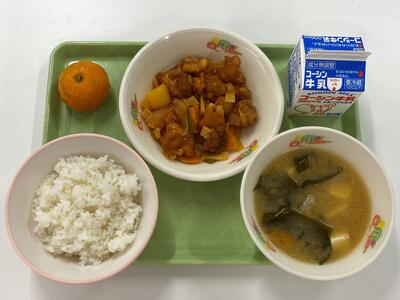 牛乳 ごはん 揚げ鶏のケチャップ煮 じゃがいもとわかめのみそ汁 冷凍みかん
