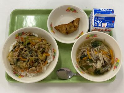 牛乳 プルコギ丼 揚げぎょうざ 肉団子ときのこのスープ