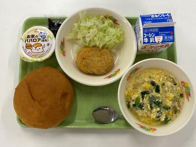 牛乳 コロッケバーガー ゆでキャベツ 洋風かき玉スープ お米のババロア