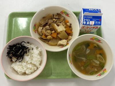牛乳 ごはん ひじきのふりかけ 大根と生揚げの煮物 ひっつみ汁