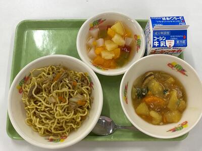 牛乳 ソース焼きそば じゃがいものピリ辛煮 カクテルゼリー