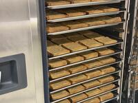 「セサミトースト」は、給食室の手作りです。溶かしバターとごまを混ぜてセサミバターを作り、一枚一枚のばしていきます。ごまは、風味を強く感じられる「すりごま」と、ぷちぷちとした食感のある「いりごま」の2種類を使いました。こんがりと焼いたら、香ばしいごまのトーストのできあがりです。
