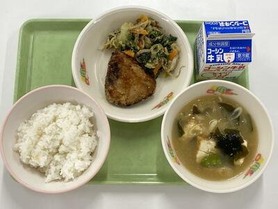 牛乳 ごはん かつおのねぎソースかけ ごま和え 厚揚げと絹さやのみそ汁