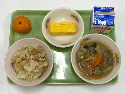 牛乳 こぎつねごはん 厚焼き卵 豚汁 冷凍みかん