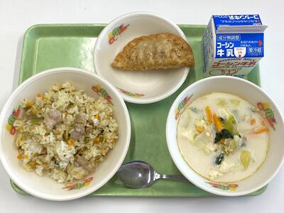 牛乳 高菜チャーハン 揚げぎょうざ 鶏肉とキャベツの白湯スープ