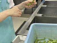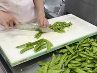 厚揚げが入ったボリューム満点のみそ汁には、季節の野菜の「さやえんどう」を使いました。ひとさやひとさや筋をとって、包丁を入れて、最後に青味として入れています。
