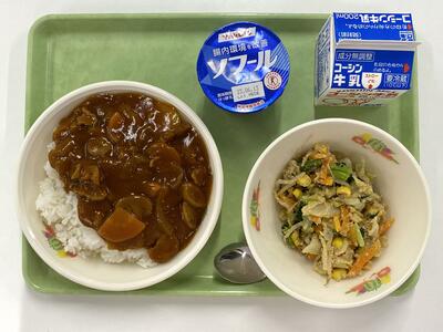 牛乳 ドライカレーライス アスパラサラダ 洋風かき玉スープ