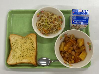 牛乳 ガーリックトースト ツナとキャベツの和え物 ポークビー