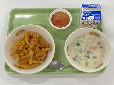 牛乳 ペンネのミートソースあえ 白花豆のポタージュ 米粉のいちごケーキ