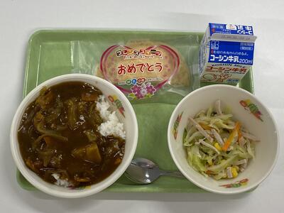 牛乳 チキンカレーライス コールスローサラダ お祝いクレープ