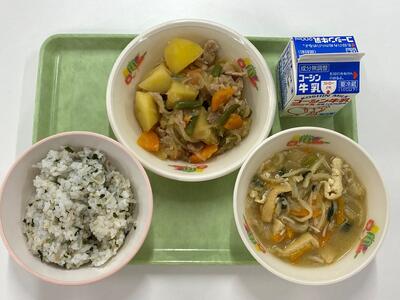 牛乳 わかめじゃこごはん 肉じゃが 切干大根のみそ汁