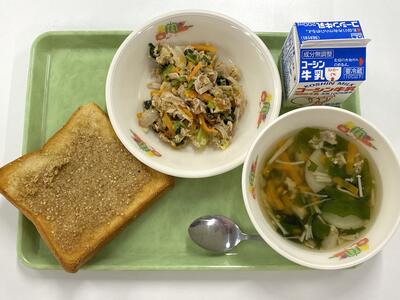 牛乳 セサミトースト ツナと野菜の炒め物 かぶの洋風スープ