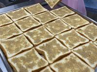 「セサミトースト」は、給食室の手作りです。溶かしバターとごまを混ぜてセサミバターを作り、一枚一枚のばしていきます。ごまは、風味を強く感じられる「すりごま」と、ぷちぷちとした食感のある「いりごま」の2種類を使いました。こんがりと焼いたら、香ばしいごまのトーストのできあがりです。