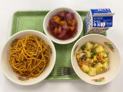 牛乳 カラフル野菜のミートソーススパゲティ ホットポテトサラダ クランベリーパンチ