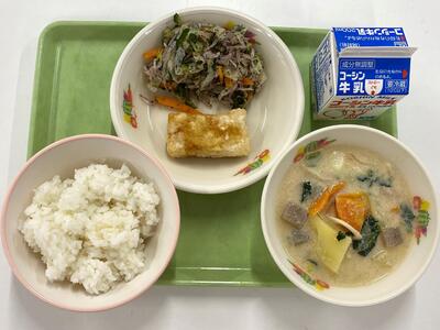牛乳 ごはん いかのかりん揚げ ゆかり和え 豆乳みそ汁