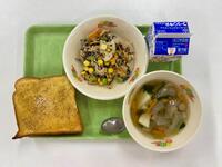 RKAYMです。今日の給食は、みりんトースト、ひじきとれんこんのサラダ、ポテトスープです。みりんトーストは、甘くて、バターとみりんが相性抜群で美味しかったです。ひじきとレンコンのサラダは、レンコンがシャキシャキしていて美味しかったです。あと、枝豆やにんじん、コーンも入っていて色合いが良かったです。ポテトスープは、ジャガイモが大きくて食べ応えがありました。 |
