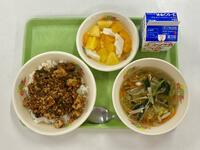 牛乳 マーボー丼 五目スープ フルーツ豆乳杏仁