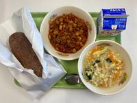 今日は人気メニューの揚げパンの日。ピュアココアに、スキムミルクと砂糖を合わせた甘い粉をまぶしました。低学年は口の周りを真っ黒にしている子がたくさんいましたが、高学年になると皆上手に食べていました。チリコンカンは、お肉と豆を使ったアメリカの郷土料理です。味つけにはチリパウダーも使っていますが、「辛い」という印象はほとんどなく、トマトと様々なハーブの香りが食欲をアップさせてくれる料理です。