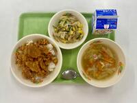 牛乳 スパイシータコス丼 ツナサラダ 白菜とベーコンのスープ