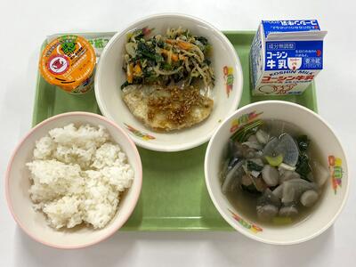 牛乳 ごはん あじの香味揚げ ごま和え いわしのつみれ汁 にんじんゼリー