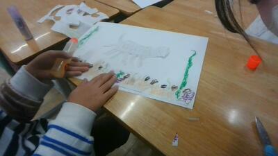 次に、こすりだした生きものを画用紙に切り貼りしています。