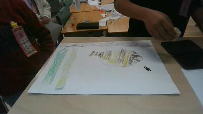 今回は、スイミーを元気づけるすばらしいものを、自分たちで考えてみることにしました!また、それを絵にする活動の中で、まずはこすりだしをしています。壁や床、階段のすべり止めなど、生きものの質感に合った凹凸を選んでいました。