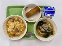 今日のごはんは、よくいためた白菜キムチを混ぜ込んだチャーハンです。しっかりと量が入っていますが、学校給食用のやさしい辛さのキムチを使っているので、低学年の子どもたちでも食べやすかったようで、よく食べていました。春巻きは、こんがりパリパリの皮が好評でした。スープはわかめがたっぷりで、食べ応えがあった様子でした。