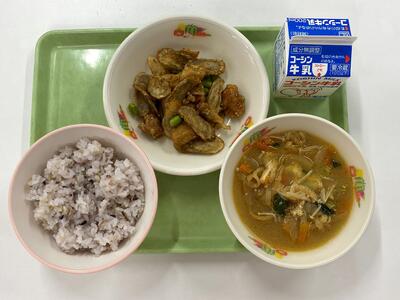 牛乳 雑穀ごはん チキンチキンごぼう 切干大根のみそ汁