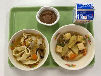 牛乳 ほうとう 角揚げのそぼろ煮 米粉のココア蒸しパン