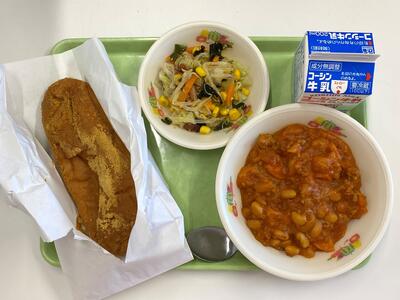 牛乳 きなこ揚げパン 海藻サラダ チリビーンズ
