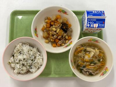 牛乳 わかめじゃこごはん 五目豆 沢煮椀