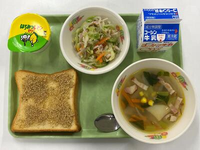 一覧へ 1. 今日の給食!11月9日(木) 投稿日時: 2023/11/10 情報担当 牛乳 セサミトースト コールスローサラダ ポテトスープ はちみつレモンゼリー セサミトーストには、ぷちぷちと食感のよい粒ごまと、風味のよいすりごまの2つを使っています。耳までおいしく食べられるように、端まで丁寧に塗りました。 セサミトーストが、甘くておいしかったです!