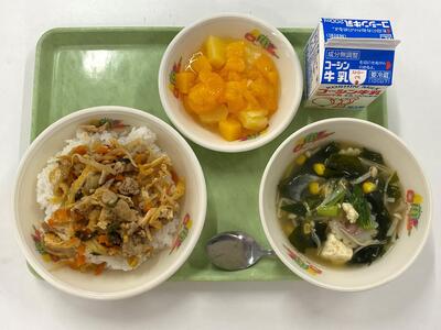 牛乳 豚キムチ丼 わかめスープ フルーツのゼリー和え