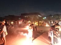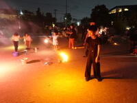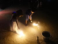 夜の校庭に手持ち花火を持ち寄っての花火大会です。