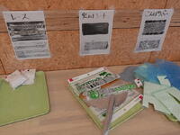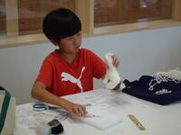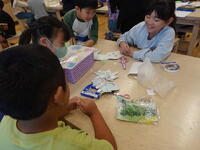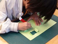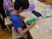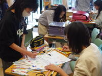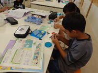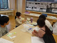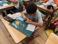 3年生は版画の授業です。厚紙で作った生き物に身近にある凸凹のある様々な素材を貼り付けて「版」を作ります。3年生は、見通しをもてる工夫として、集めた凸凹のある材料(梱包材料、段ボール、毛糸、アルミホイルなど)を触ったり、試し刷りをしたりする時間を設けました。様々な素材の中から、自分のつくりだす作品にあった素材を選んで貼っていきます。
