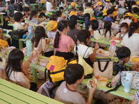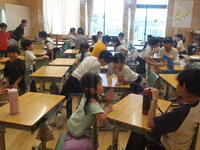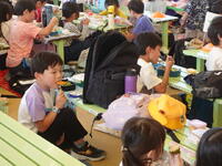 「カレー、おいしかったでーす!」1年生はすでに完食!の様子。
